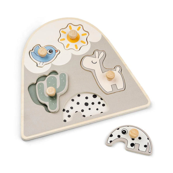 • five wooden pieces - little fingers can easily grasp them and help put Lalee's puzzle back together